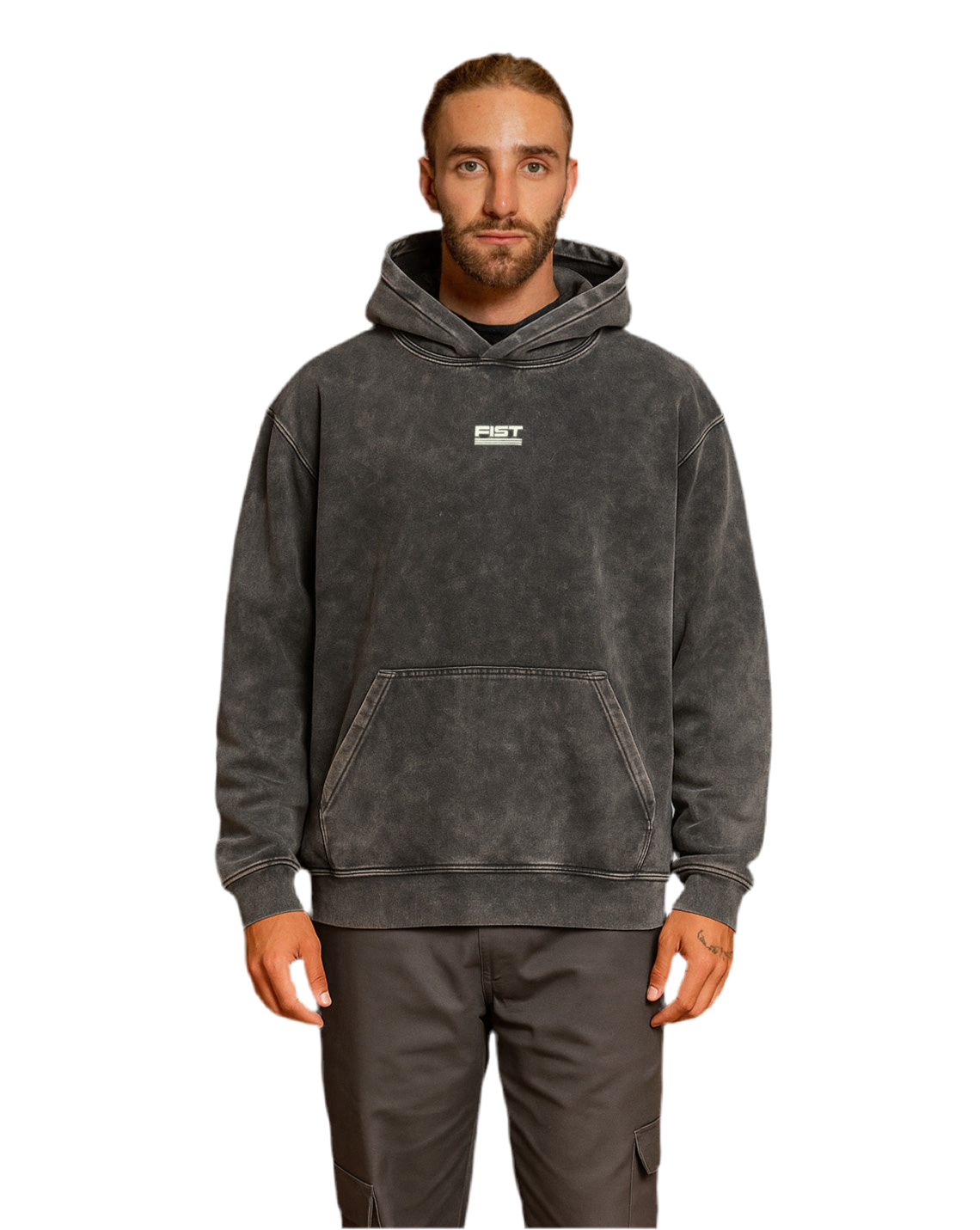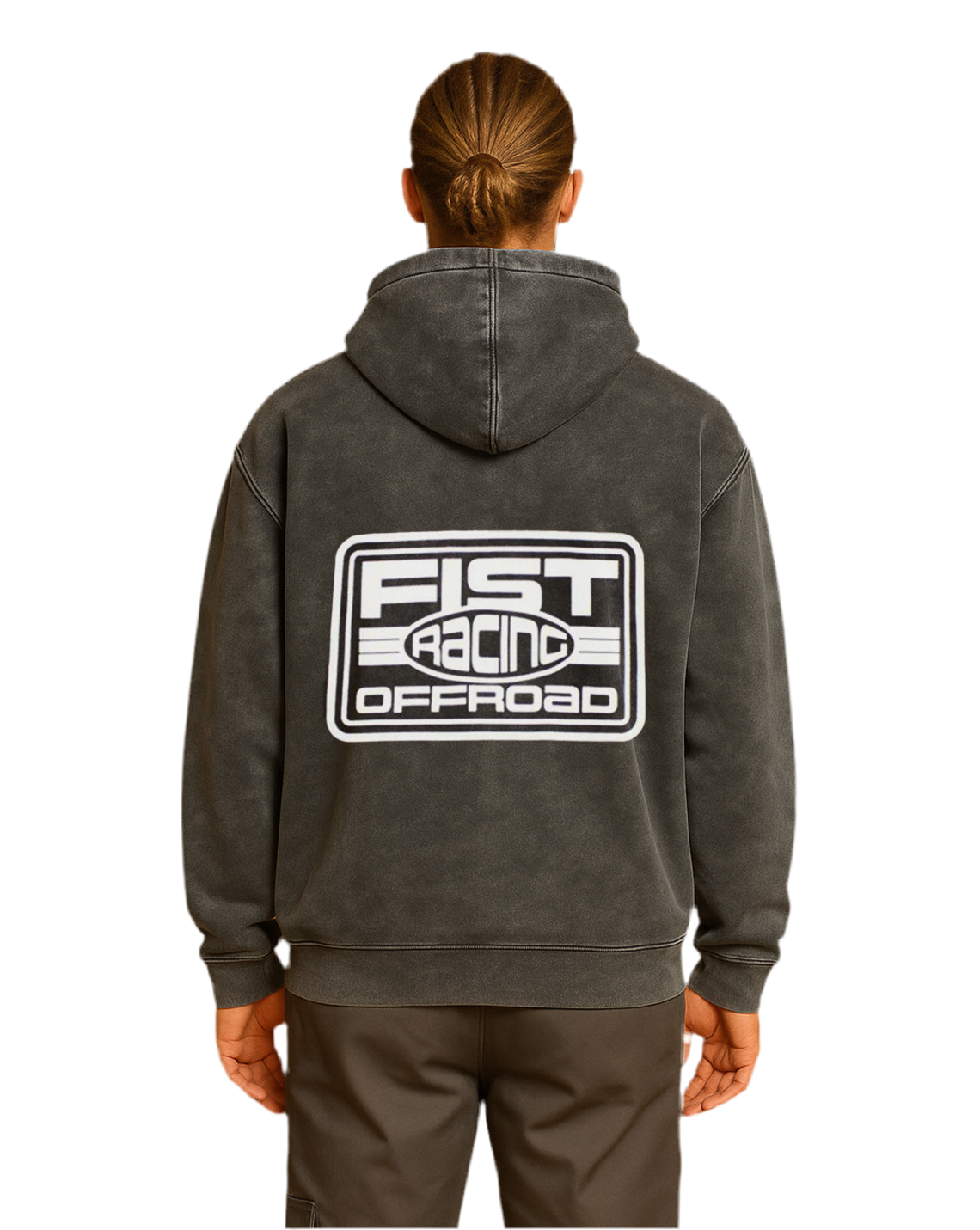 Buzo en tela burda, pesada con estampado en pecho y espalda, con acabado acid wash.