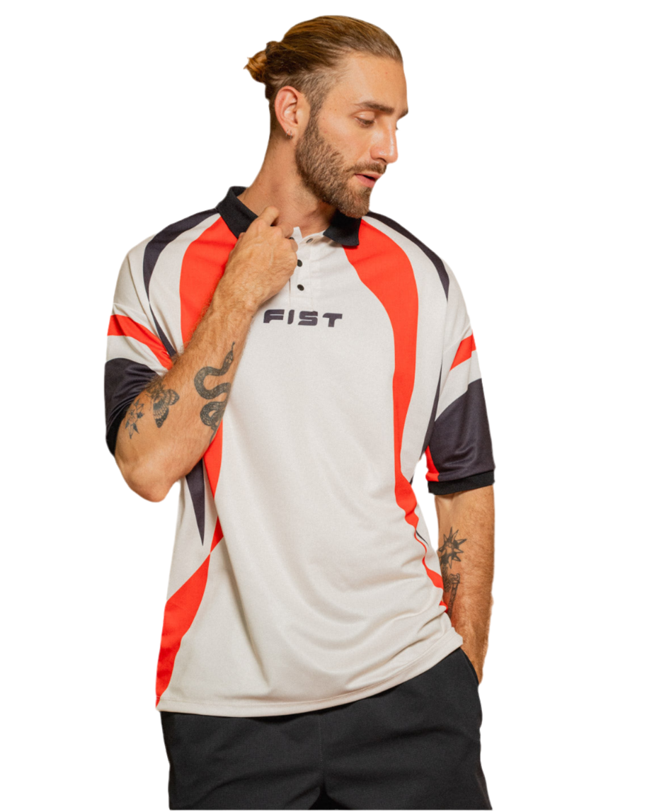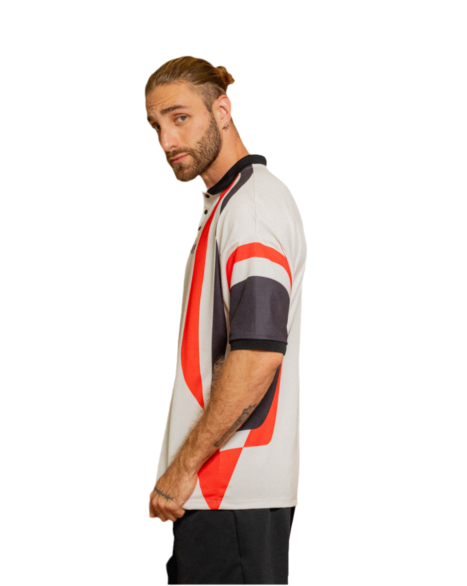 Polo hecha en tela piqué deportiva con arte sublimado, cuello y puños en rib tejido.