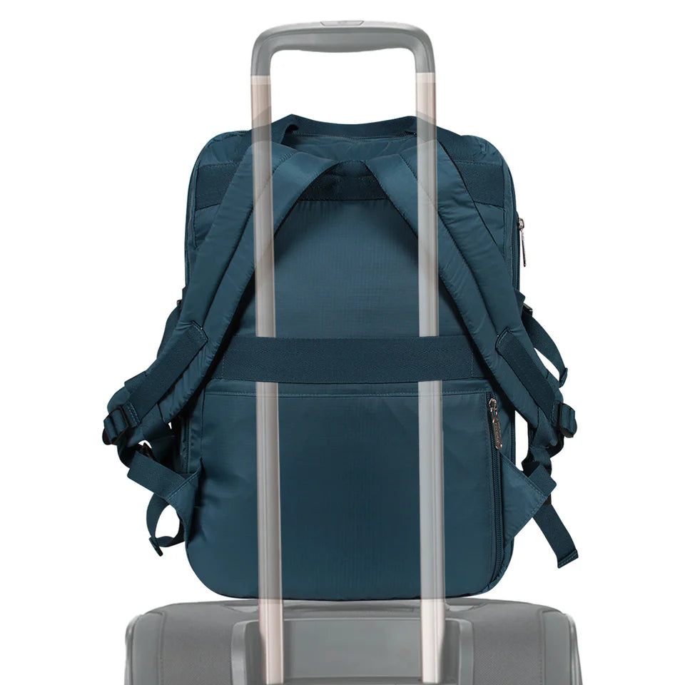 Ergonomía y confort: Cargaderas acolchadas y ajustables, espaldar con espuma para mayor comodidad, y correa trasera para sujetar al carry-on.